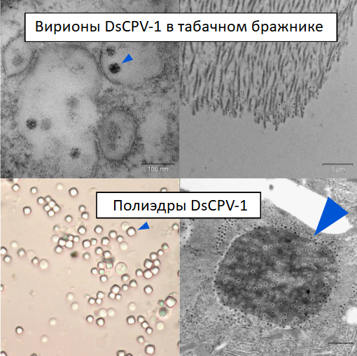 Рисунок — Микроскопия вирионов и полиэдров вируса DsCPV-1. Верхний ряд: электронная микроскопия вирионов в клетках кишечника табачного бражника (M. sexta). Нижний ряд: световая микроскопия полиэдров DsCPV-1 (слева) и их ультраструктура с характерными вирионами внутри (справа). Синие стрелки указывают на ключевые элементы: «голые» вирионы (верхний ряд) и кристаллические полиэдры (нижний ряд).