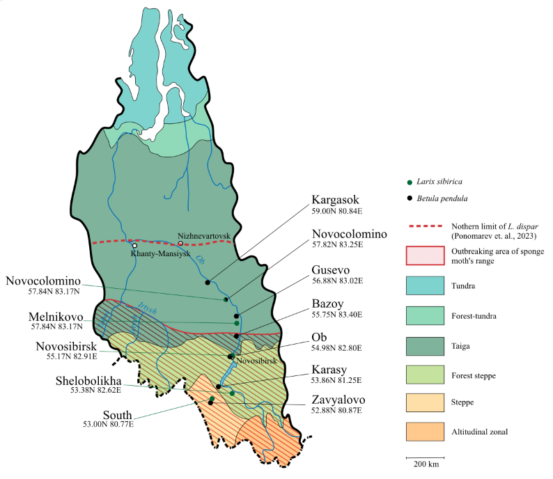 Другое исследование для изучения потенциальной адаптации непарного шелкопряда к серверным популяциям растений-хозяев при его экспансии на север было проведено в Западной Сибири (Subbotina et al., 2025, Forest Ecology and Management). В исследовании изучалась роль химических защитных соединений берёзы повислой (Betula pendula) и лиственницы сибирской (Larix sibirica), ассоциированная с широтой произрастания растений, в потенциальном сдерживании северной экспансии непарного шелкопряда (Lymantria dispar) — одного из наиболее опасных лесных фитофагов Евразии.
