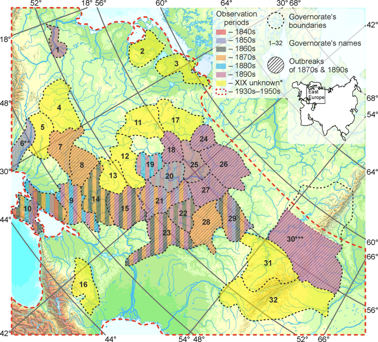 Рисунок — Заселенность непарным шелкопрядом европейской части России.
