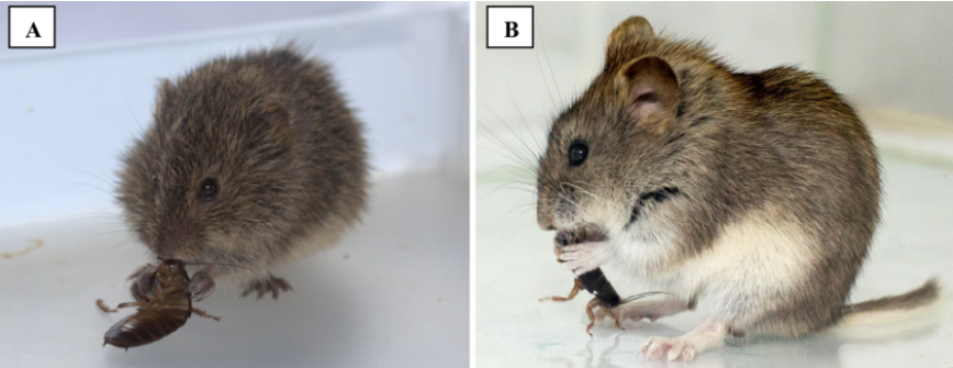 Узкоголовая полевка L. gregalis (А) и тувинская серебристая полевка A. tuvinicus (B) поедают свою добычу -а таракан-омар N. cinerea.