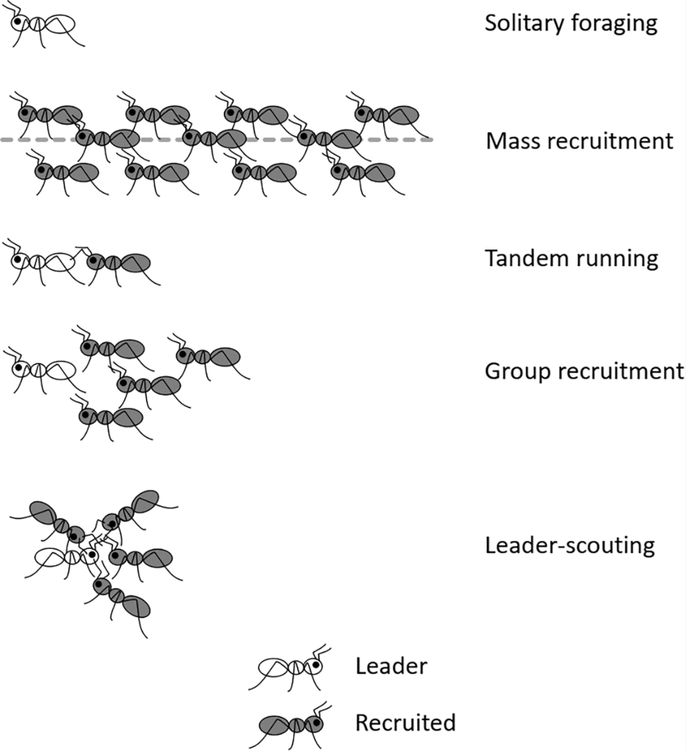 Рис. У муравьев существует четыре основных категории стратегий привлечения новых особей: массовое привлечение, совместный бег, групповое привлечение и поиск лидера.