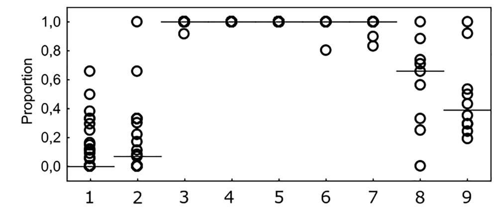 Доля нападений, начавшихся с укуса, в полных стереотипах успешных охотников. Цифры указывают на виды: (1) монгольская песчанка (n = 30), (2) жирнохвостая песчанка (n = 21), (3) тувинская серебристая полевка (n = 39), (4) плоскоголовая полевка (n = 30), (5) олхонская горная полевка (n = 71), (6) восточноевропейская полевка (n = 7), (7) узкоголовая полевка (n = 11), (8) карликовый хомячок Кэмпбелла (n = 8), (9) джунгарский хомячок (n = 11).