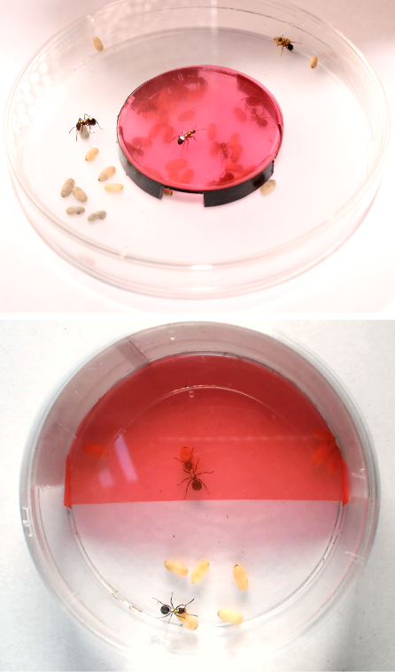 Рис. Экспериментальные установки для изучения организации транспортировки и ухода за расплодом в групповых (10 рабочих, 40 куколок) и парных (2 рабочих, 10 куколок) тестах.