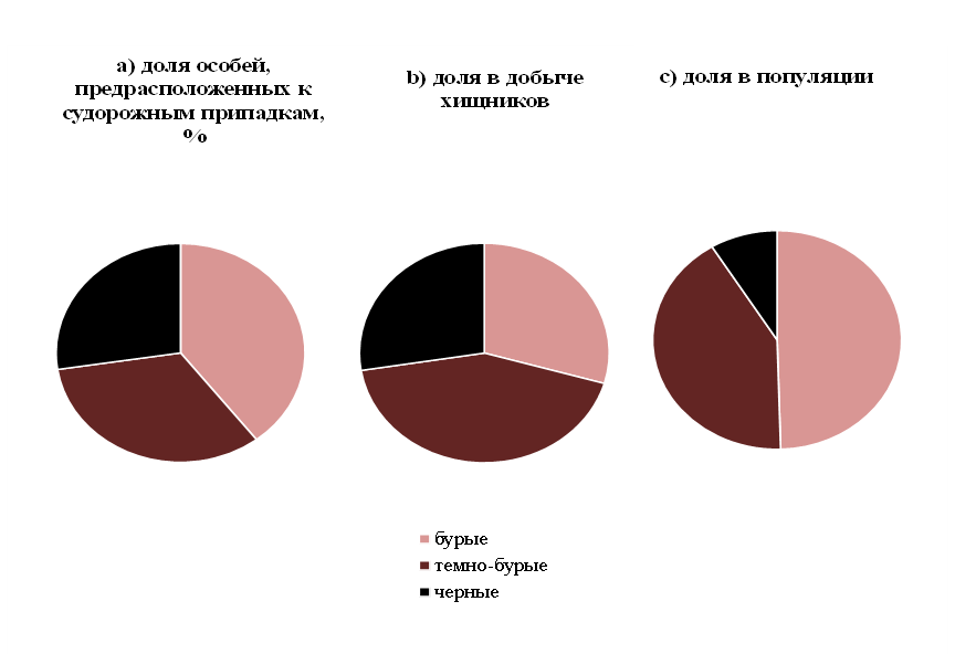Рефлекторные судорожные припадки, наблюдаемые у мышевидных грызунов при тактильном раздражении, связывают с защитой от хищников. У водяных полевок (Arvicola amphibius), разводимых в лаборатории, выявлена наследственная предрасположенность к судорогам, связанная с полиморфизмом по окраске шерсти. Среди бурых особей, гомозиготных по гену локуса агути (АА), доля предрасположенных к судорогам была выше, чем среди гетерозиготных темно-бурых (Аа). Минимальной она была среди черных (аа) особей. Поскольку доля черных особей в добыче хищников значительно больше, чем их встречаемость в популяции, можно предполагать, что бурые особи, наиболее предрасположенные к судорогам, реже поедаются хищниками. Исходя из полученных данных, водяную полевку можно рекомендовать в качестве модели для изучения этиологии судорожных состояний у человека.
