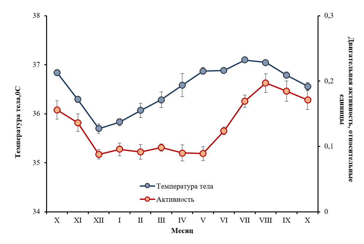 Рисунок. Динамика температуры тела и двигательной активности  у обыкновенной слепушонки в разные месяцы года.