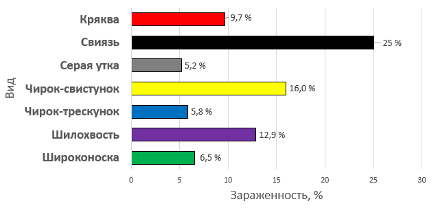 Рисунок. Зараженность низкопатогенными штаммами вируса птичьего гриппа у обследованных птиц рода Anas в период исследований.