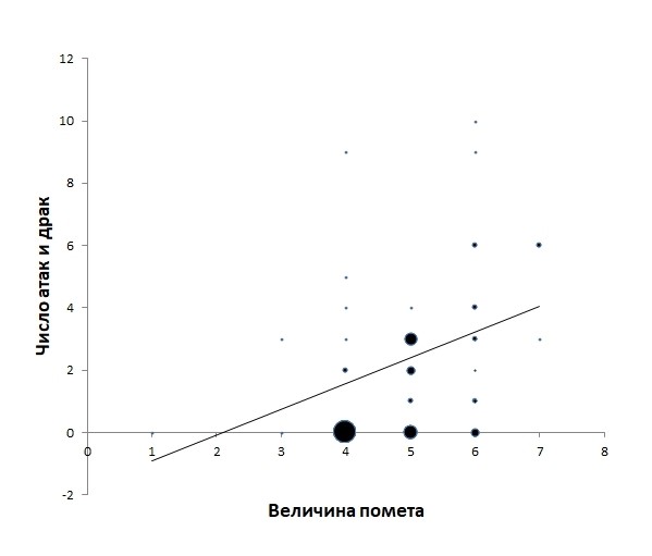 Рисунок. Зависимость частоты актов агрессии от величины помета при рождении