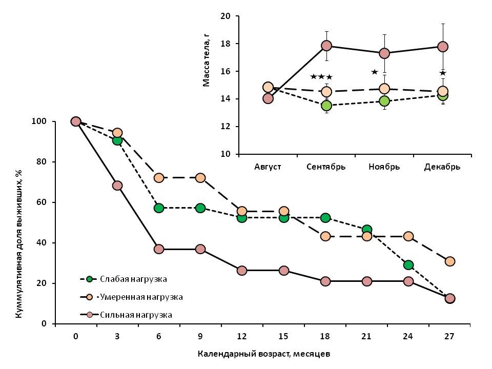 Рисунок. Динамика массы тела и выживаемости у узкочерепных полевок, отловленных в местообитаниях с разным уровнем антропогенной нагрузки.